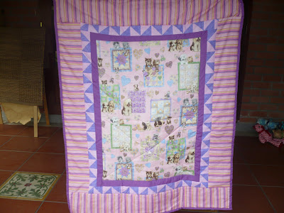 Found this lovely cat & dog fabric in PJ and bought a meter. Did a pillow case for Sara and the left over i made into this quilt. All pink and purple all over. Then i even have a matching teddy of the same material to go with it. Splendid! But teddy not ready yet. Will put her up once she's done.